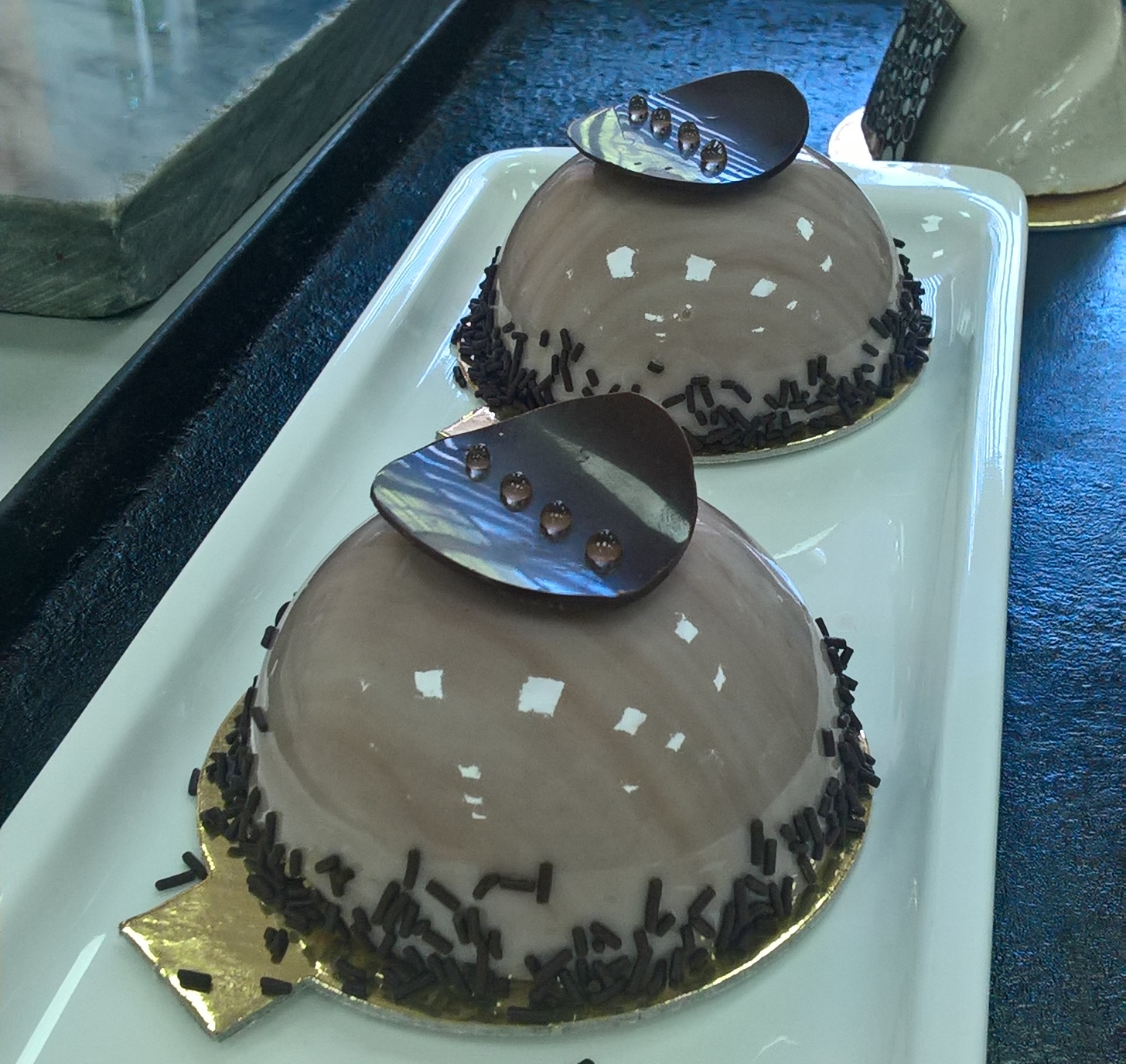 Наполнить силиконовую форму муссом и поместить во внутрь пралине. Закрыть сверху муссом и убрать в холод до застывания мусса. Получившиеся заготовки заглазировать гляссажем и дать ему застыть. Края десерта обсыпать посыпкой, а сверху выложить заготовку из шоколадной глазури и отсадить на нее кондитерский гель в виде капелек.