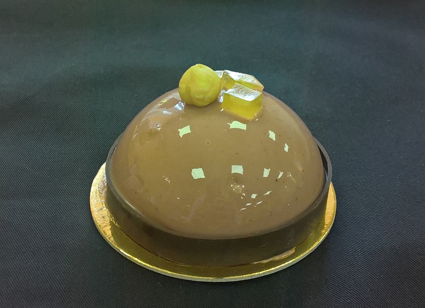 Заполнить муссом силиконовые формы, поместить туда желе и убрать в холод до застывания мусса. Получившуюся заготовку покрыть гляссажем, оставить до застывания. Надеть шоколадное кольцо, сверху выложить кубики мармелада и лесной орех.